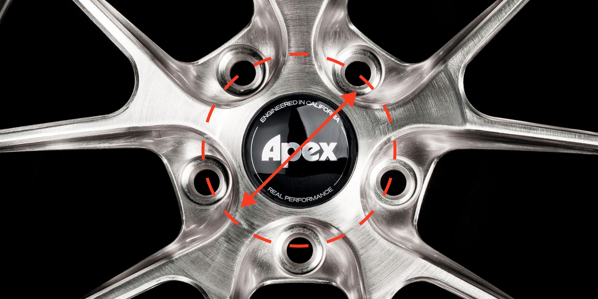 A wheel’s bolt pattern, which is also referred to as its pitch circle diameter (PCD) or lug pattern, is the diameter of the circle formed by the studs/bolt holes on a wheel. This diameter is measured as if the circle passes through the center of each of those bolt holes, as illustrated above. Bolt patterns are typically displayed using two numbers like 5x120mm or 4x100mm. The first number is the number of mounting holes on the wheel. The second number is the measurement found between two points of a circle centered within those stud or bolt holes. The way that’s measured is illustrated in the image above by the line with the arrows. If a car has a 5x120mm bolt pattern and centerbore, it has 5 lug holes and a 120mm lug circle spacing. That second measurement can be presented in either millimeters (5x120mm) or inches (5x4.5”), but most modern passenger cars use millimeters. All Apex wheels use millimeters for their bolt pattern, however trucks, offroad or heavy-duty work vehicles, and some older domestic vehicles may use inches.