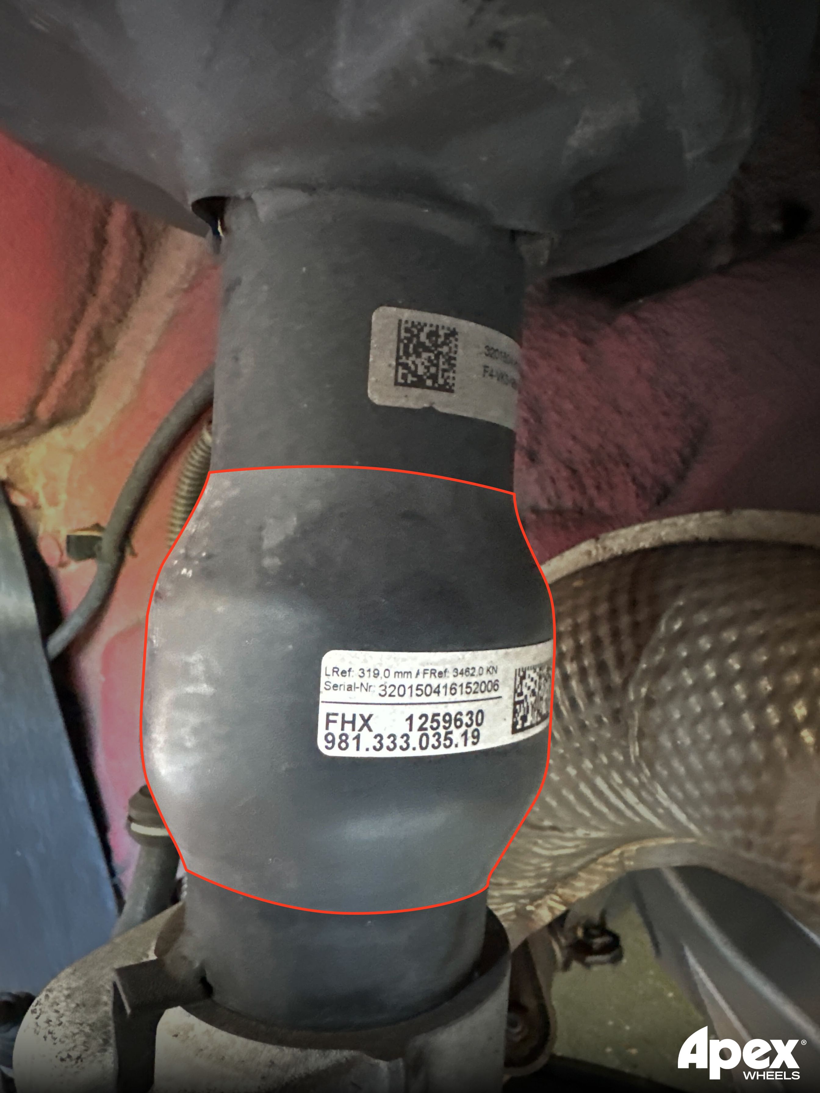 Select trim levels and/or options on 981 or 718 Cayman/Boxsters can potentially have a rear shock body that has a change in diameter partway up the shock. This diameter increase reduces inner clearance and can cause issues on select fitments that should be checked ahead of time. If your rear shock looks like the image below, keep reading, as this article is for you. If your rear shock does not have this larger diameter section, then any spacers mentioned in this article do not pertain to your car.