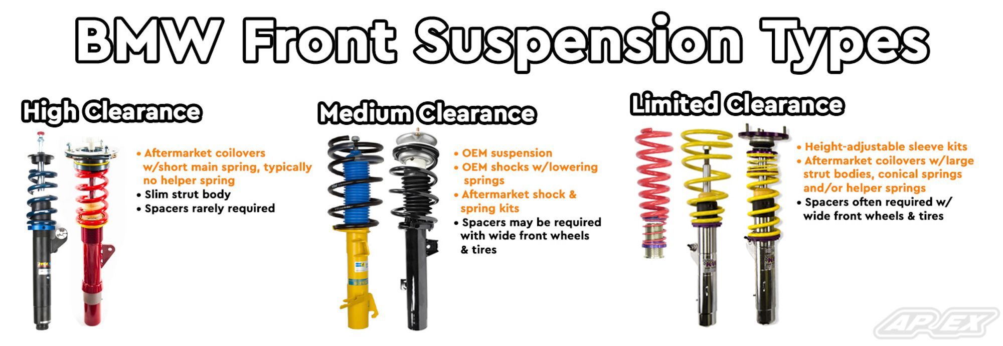 Aside from how an auto manufacturer designs the body work of a given vehicle, one of the most important contributing factors in determining how much space you have to work with is the genetic makeup of your OEM or aftermarket suspension configuration. Just as the performance capabilities drastically vary from one suspension to another, each impedes wheel and tire clearance differently due to a variance in spring shape (conical vs linear), spring length, strut body diameter, whether or not helper/tender springs are present, and ultimately the overall stack height.